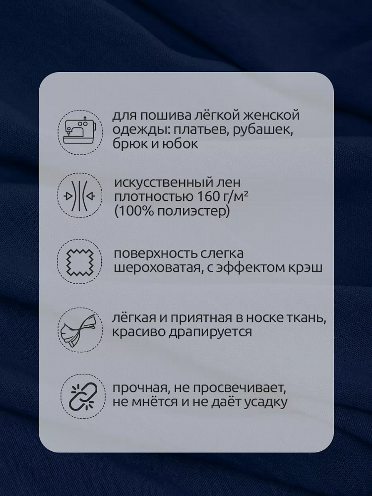 Ткань Лен Манго является искусственным аналогом ткани из натурального состава и имеет схожие текстурные характеристики. Благодаря современным технологиям его производства, краска стойко держится на ткани и при контакте с водой не оставляет следов и разводов. В отличие от натурального льна, лен Манго не требует тщательного разглаживания утюгом. Применяется для пошива одежды: летних платьев, брюк, юбок, сарафанов, рубашек и т.д. При стирке рекомендуется применять универсальные моющие средства без агрессивных компонентов в составе, с температурой воды до 40 градусов.