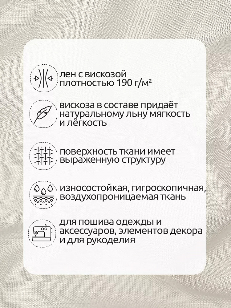В состав данной ткани входит лен – натуральный, экологичный материал. Вискоза-добавлена для умягчения ткани, придания ей легкости, воздушности и уменьшения сминаемости. Экологичные, натуральные волокна не вызывают аллергии, позволяют коже дышать. Отличная ткань для людей, которые выбирают экологичность и практичность. Ткань имеет выраженную структуру полотна. Лен широко применяется для пошива одежды для взрослых и детей, народных костюмов, постельных принадлежностей, для оформления интерьера, изготовления кукол и игрушек.Однотонные ткани это классический ассортимент, который всегда будет актуален и востребован.