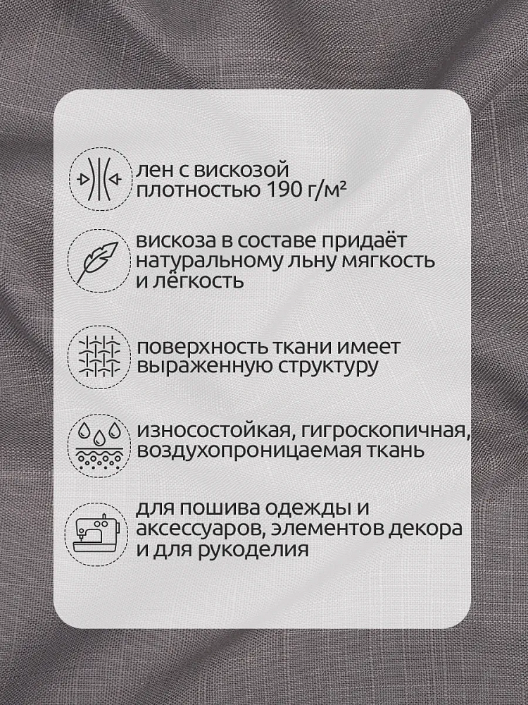 В состав данной ткани входит лен – натуральный, экологичный материал. Вискоза-добавлена для умягчения ткани, придания ей легкости, воздушности и уменьшения сминаемости. Экологичные, натуральные волокна не вызывают аллергии, позволяют коже дышать. Отличная ткань для людей, которые выбирают экологичность и практичность. Ткань имеет выраженную структуру полотна. Лен широко применяется для пошива одежды для взрослых и детей, народных костюмов, постельных принадлежностей, для оформления интерьера, изготовления кукол и игрушек.Однотонные ткани это классический ассортимент, который всегда будет актуален и востребован.