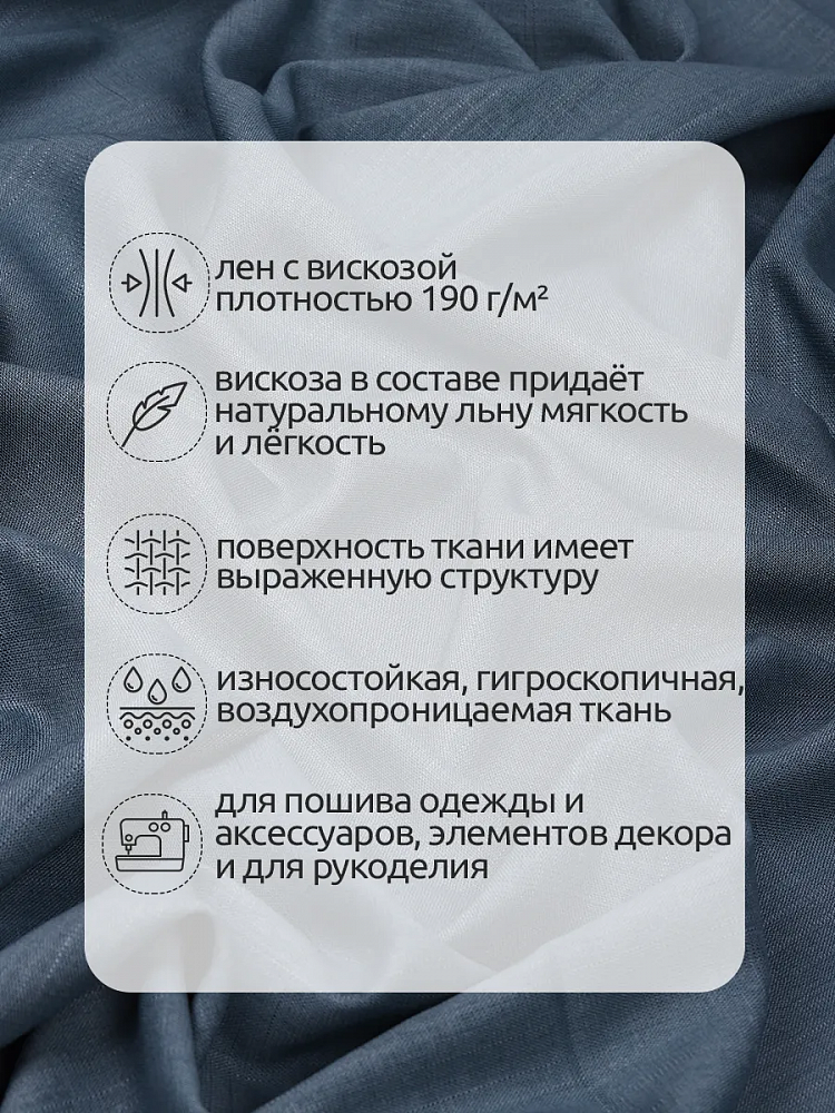 В состав данной ткани входит лен – натуральный, экологичный материал. Вискоза-добавлена для умягчения ткани, придания ей легкости, воздушности и уменьшения сминаемости. Экологичные, натуральные волокна не вызывают аллергии, позволяют коже дышать. Отличная ткань для людей, которые выбирают экологичность и практичность. Ткань имеет выраженную структуру полотна. Лен широко применяется для пошива одежды для взрослых и детей, народных костюмов, постельных принадлежностей, для оформления интерьера, изготовления кукол и игрушек.Однотонные ткани это классический ассортимент, который всегда будет актуален и востребован.