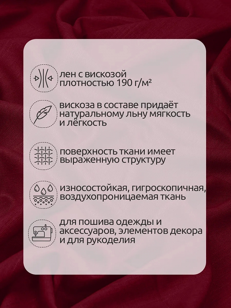В состав данной ткани входит лен – натуральный, экологичный материал. Вискоза-добавлена для умягчения ткани, придания ей легкости, воздушности и уменьшения сминаемости. Экологичные, натуральные волокна не вызывают аллергии, позволяют коже дышать. Отличная ткань для людей, которые выбирают экологичность и практичность. Ткань имеет выраженную структуру полотна. Лен широко применяется для пошива одежды для взрослых и детей, народных костюмов, постельных принадлежностей, для оформления интерьера, изготовления кукол и игрушек.Однотонные ткани это классический ассортимент, который всегда будет актуален и востребован.