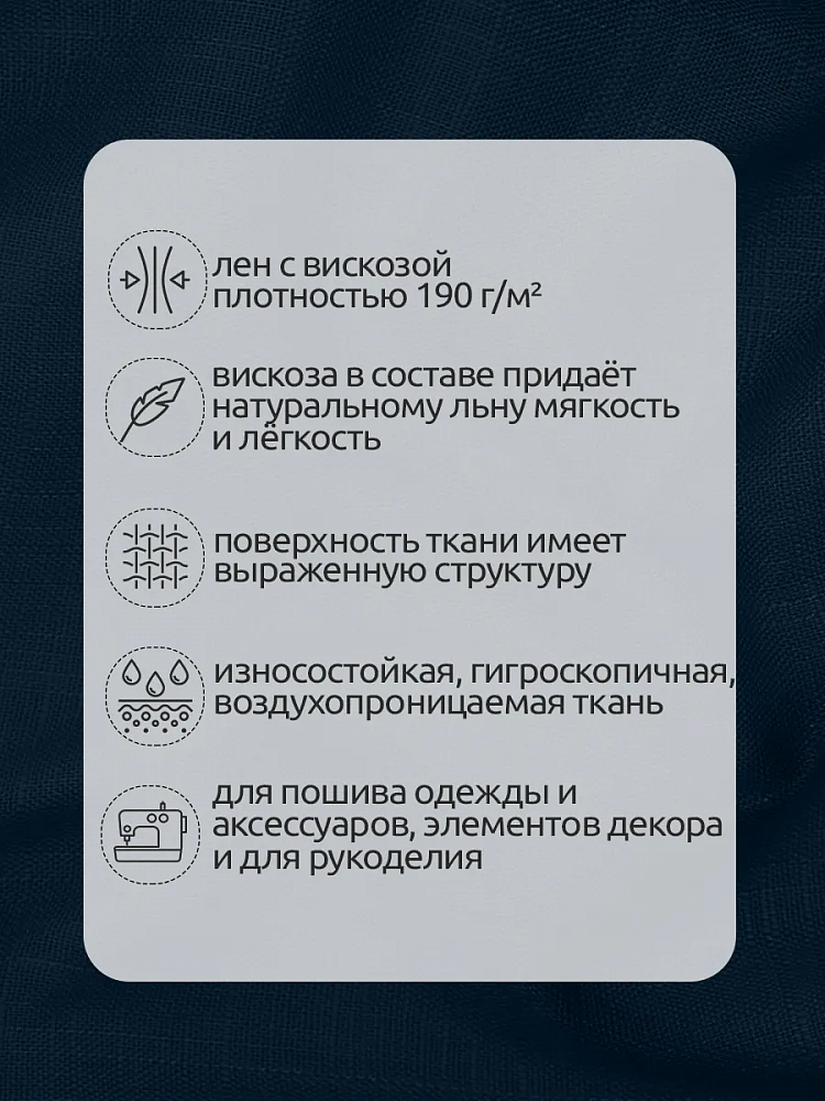 В состав данной ткани входит лен – натуральный, экологичный материал. Вискоза-добавлена для умягчения ткани, придания ей легкости, воздушности и уменьшения сминаемости. Экологичные, натуральные волокна не вызывают аллергии, позволяют коже дышать. Отличная ткань для людей, которые выбирают экологичность и практичность. Ткань имеет выраженную структуру полотна. Лен широко применяется для пошива одежды для взрослых и детей, народных костюмов, постельных принадлежностей, для оформления интерьера, изготовления кукол и игрушек.Однотонные ткани это классический ассортимент, который всегда будет актуален и востребован.