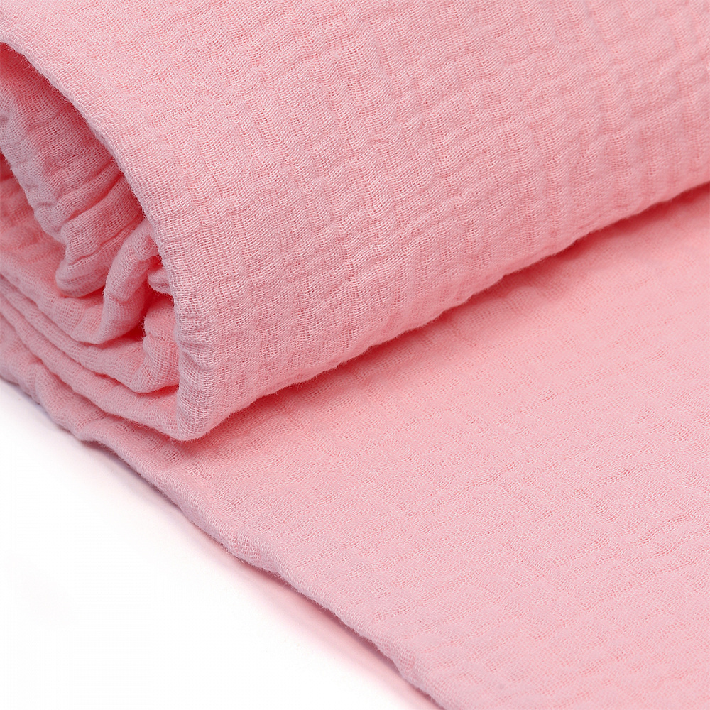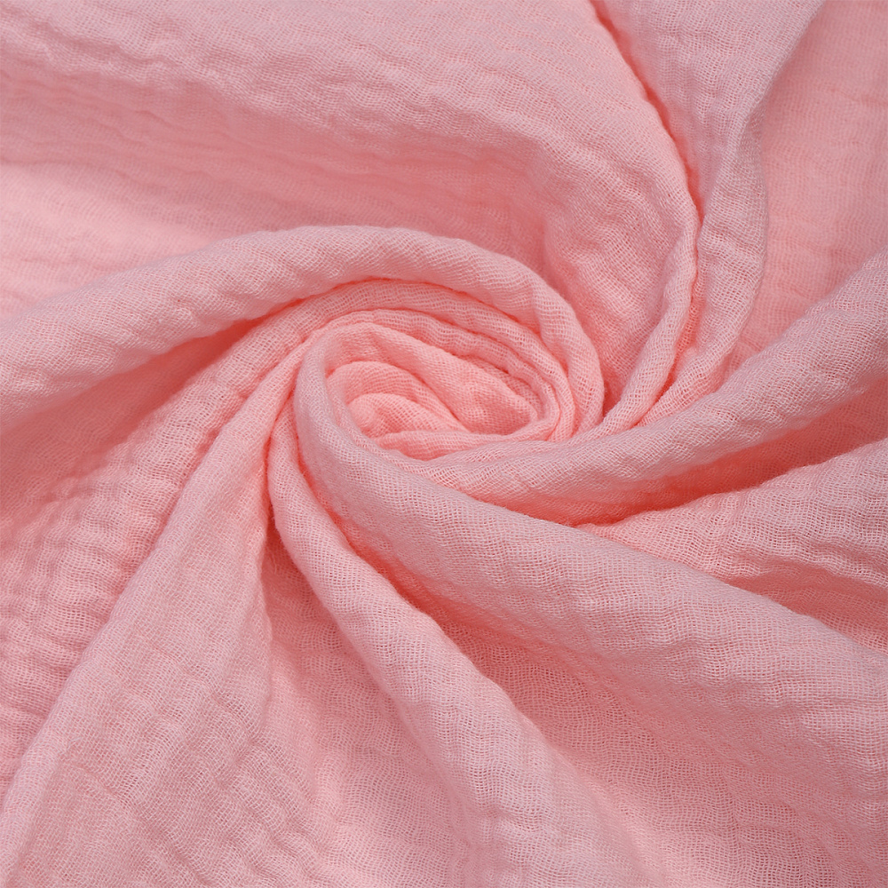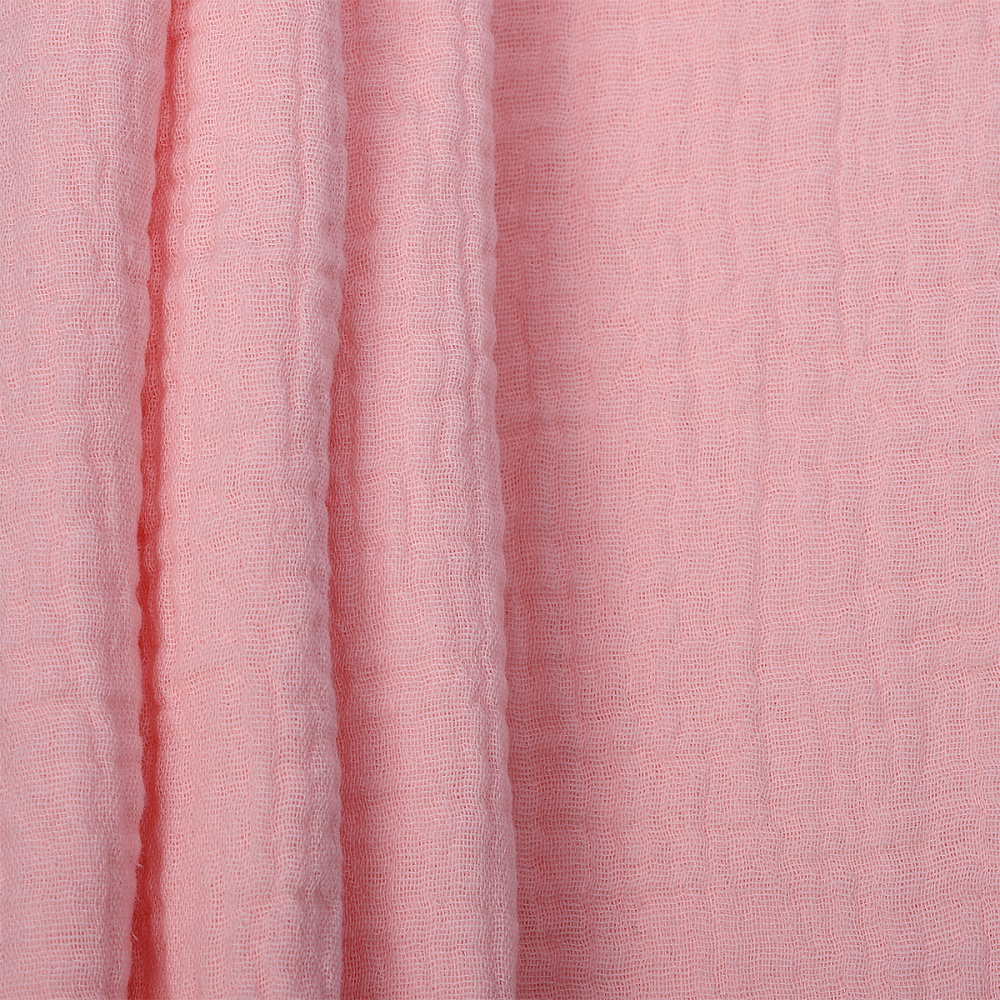 Двухслойная ткань Муслин с эффектом крэш — это натуральное волокно особого плетения хлопковых нитей. Муслин имеет легкую текстуру, нежную поверхность, а ввиду жатого эффекта создается впечатление воздушности ткани. Несмотря на внешнюю рыхлость, нити Муслина туго скучены, что придаёт изделию прочность. Также ткань обладает всеми положительными свойствами хлопковых полотен: воздухопроницаемостью и гипоаллергенностью, износостойкостью и гигроскопичностью, не подвержен появлению катышков и удобен в носке. Муслиновые изделия смотрятся интересно, стильно и необычно: трендовые летние костюмы, топы, легкие платья и рубашки, детская одежда и нежные домашние пижамы свободного кроя. Благодаря многослойности муслин не просвечивает, так что все изделия можно шить без подклада. Муслин требует грамотного ухода: допускается машинная стирка в деликатном режиме на низких оборотах при температуре не выше 40 градусов. Средства для стирки должны быть мягкими, без хлора, идеально подойдет жидкий гель для деликатных тканей. Не рекомендуется выкручивать изделия, сушить следует в расправленном виде на горизонтальной поверхности, чтобы избежать деформации формы изделия. Лучше всего пользоваться отпаривателем — он поможет сохранить воздушную фактуру нити и ее мягкость. При правильном уходе цвет не вымывается и не тускнеет. Ткань дает усадку в среднем 5%.