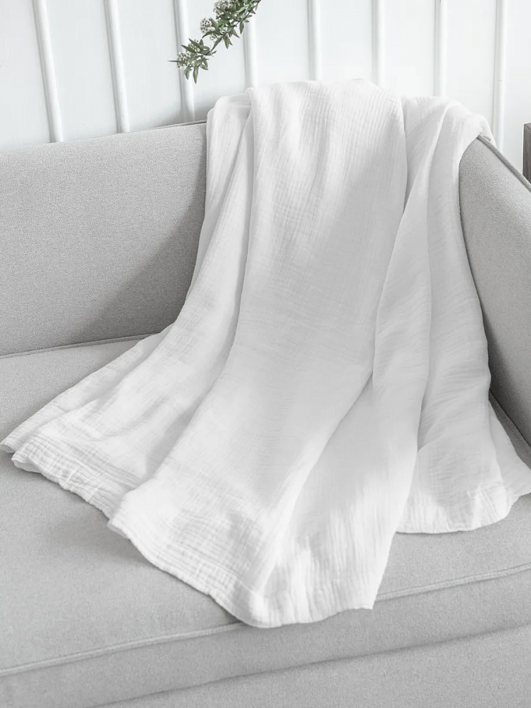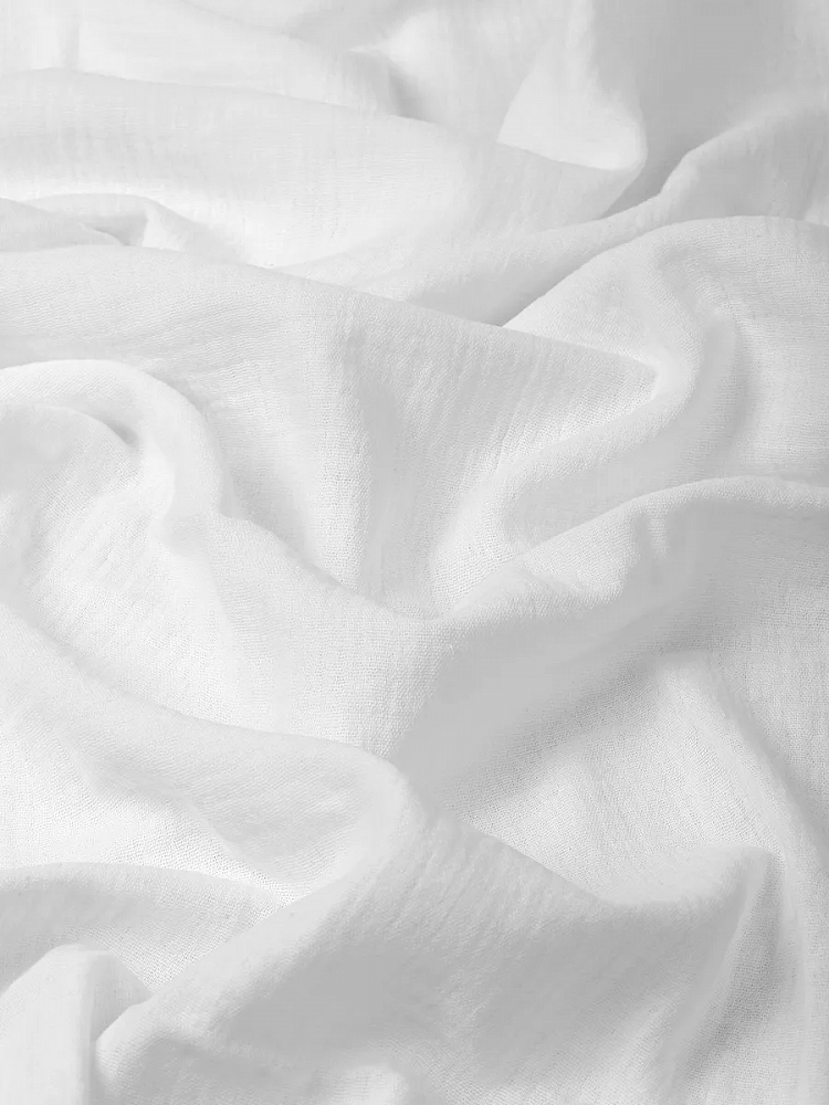 Двухслойная ткань Муслин с эффектом крэш — это натуральное волокно особого плетения хлопковых нитей. Муслин имеет легкую текстуру, нежную поверхность, а ввиду жатого эффекта создается впечатление воздушности ткани. Несмотря на внешнюю рыхлость, нити Муслина туго скучены, что придаёт изделию прочность. Также ткань обладает всеми положительными свойствами хлопковых полотен: воздухопроницаемостью и гипоаллергенностью, износостойкостью и гигроскопичностью, не подвержен появлению катышков и удобен в носке. Муслиновые изделия смотрятся интересно, стильно и необычно: трендовые летние костюмы, топы, легкие платья и рубашки, детская одежда и нежные домашние пижамы свободного кроя. Благодаря многослойности муслин не просвечивает, так что все изделия можно шить без подклада. Муслин требует грамотного ухода: допускается машинная стирка в деликатном режиме на низких оборотах при температуре не выше 40 градусов. Средства для стирки должны быть мягкими, без хлора.