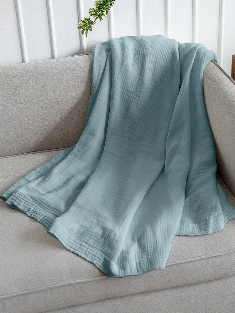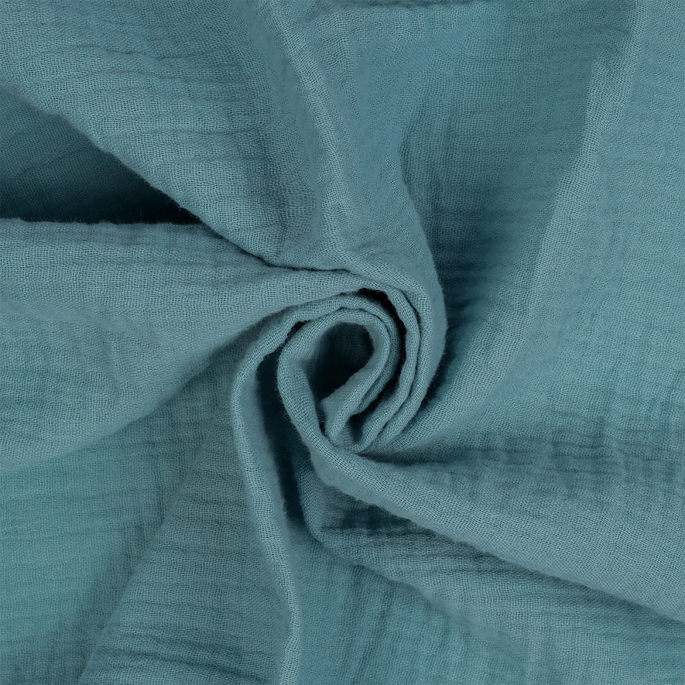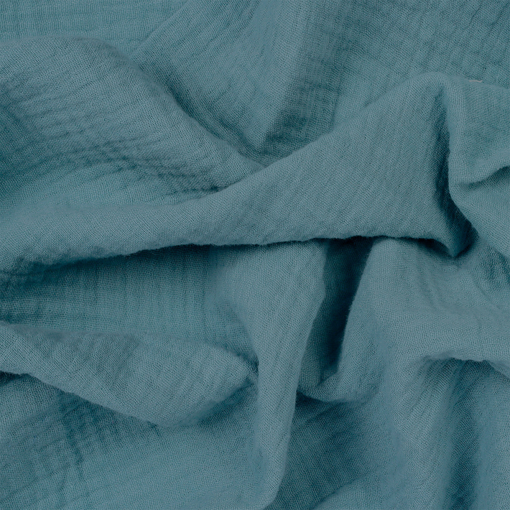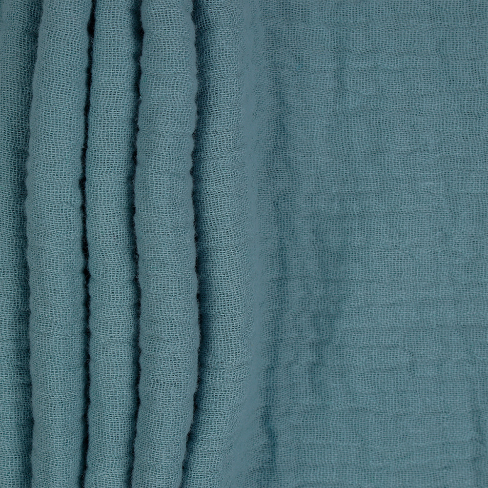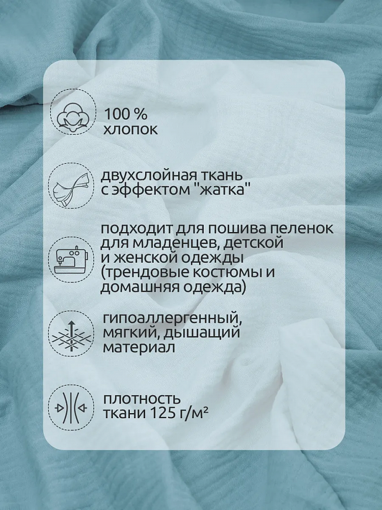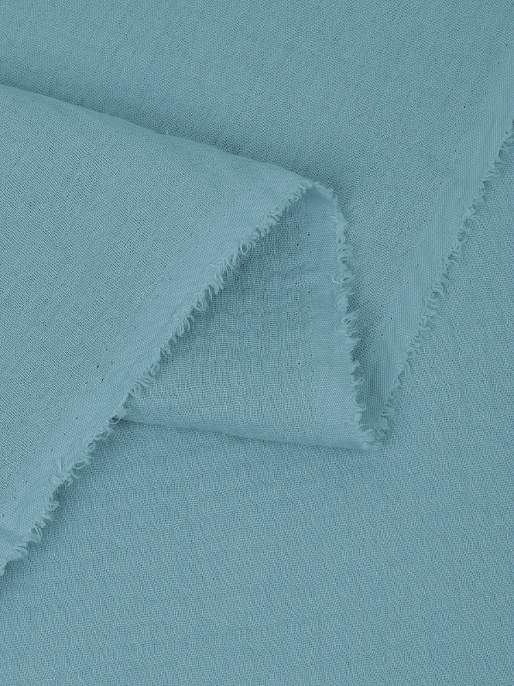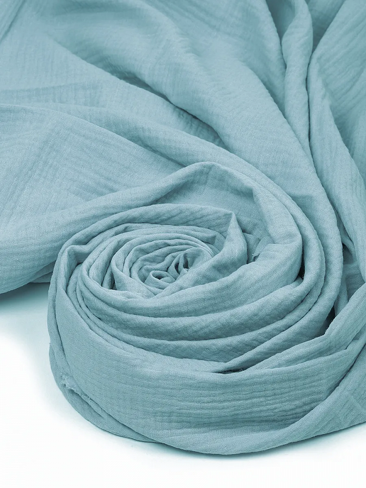 Двухслойная ткань Муслин с эффектом крэш — это натуральное волокно особого плетения хлопковых нитей. Муслин имеет легкую текстуру, нежную поверхность, а ввиду жатого эффекта создается впечатление воздушности ткани. Несмотря на внешнюю рыхлость, нити Муслина туго скучены, что придаёт изделию прочность. Также ткань обладает всеми положительными свойствами хлопковых полотен: воздухопроницаемостью и гипоаллергенностью, износостойкостью и гигроскопичностью, не подвержен появлению катышков и удобен в носке. Муслиновые изделия смотрятся интересно, стильно и необычно: трендовые летние костюмы, топы, легкие платья и рубашки, детская одежда и нежные домашние пижамы свободного кроя. Благодаря многослойности муслин не просвечивает, так что все изделия можно шить без подклада. Муслин требует грамотного ухода: допускается машинная стирка в деликатном режиме на низких оборотах при температуре не выше 40 градусов. Средства для стирки должны быть мягкими, без хлора.
