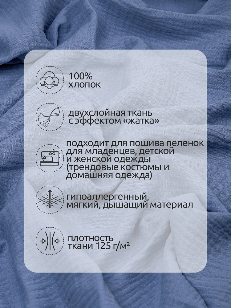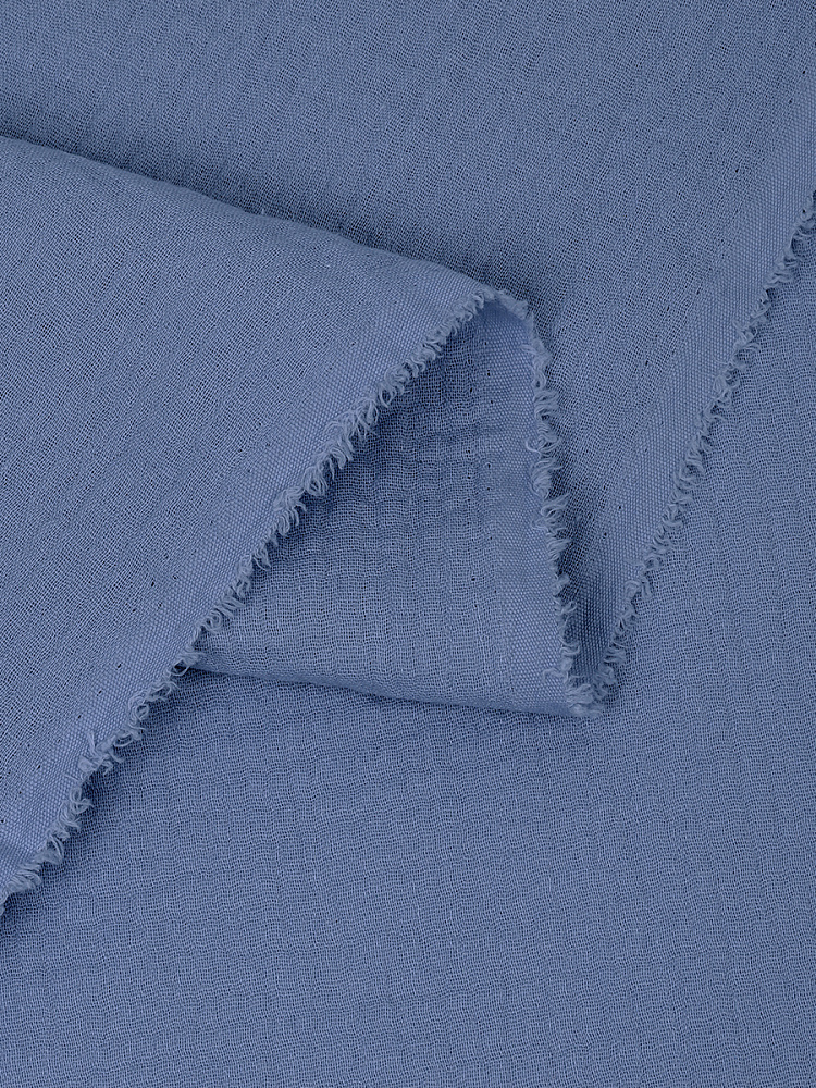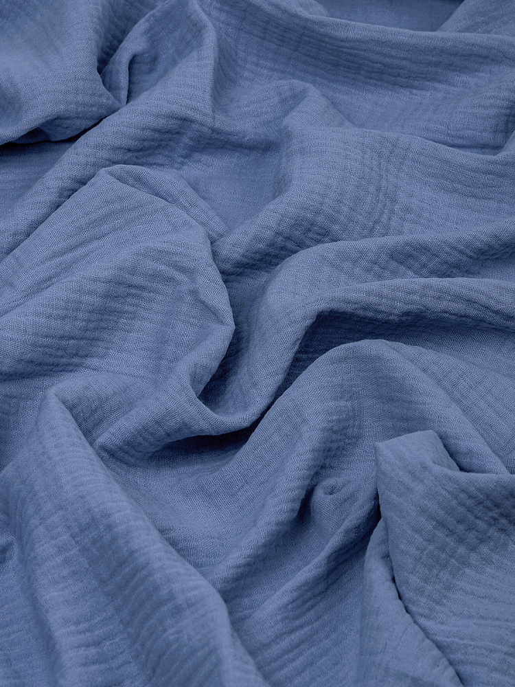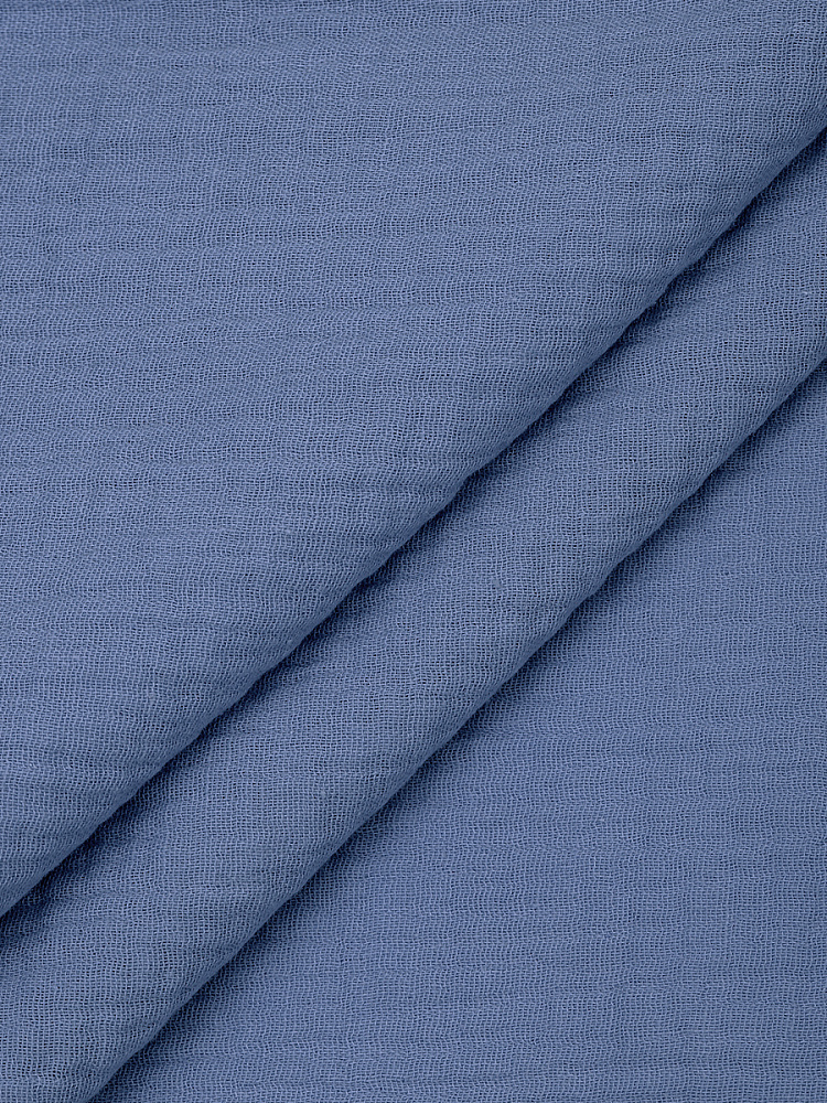 Двухслойная ткань Муслин с эффектом крэш — это натуральное волокно особого плетения хлопковых нитей. Муслин имеет легкую текстуру, нежную поверхность, а ввиду жатого эффекта создается впечатление воздушности ткани. Несмотря на внешнюю рыхлость, нити Муслина туго скучены, что придаёт изделию прочность. Также ткань обладает всеми положительными свойствами хлопковых полотен: воздухопроницаемостью и гипоаллергенностью, износостойкостью и гигроскопичностью, не подвержен появлению катышков и удобен в носке. Муслиновые изделия смотрятся интересно, стильно и необычно: трендовые летние костюмы, топы, легкие платья и рубашки, детская одежда и нежные домашние пижамы свободного кроя. Благодаря многослойности муслин не просвечивает, так что все изделия можно шить без подклада. Муслин требует грамотного ухода: допускается машинная стирка в деликатном режиме на низких оборотах при температуре не выше 40 градусов. Средства для стирки должны быть мягкими, без хлора.