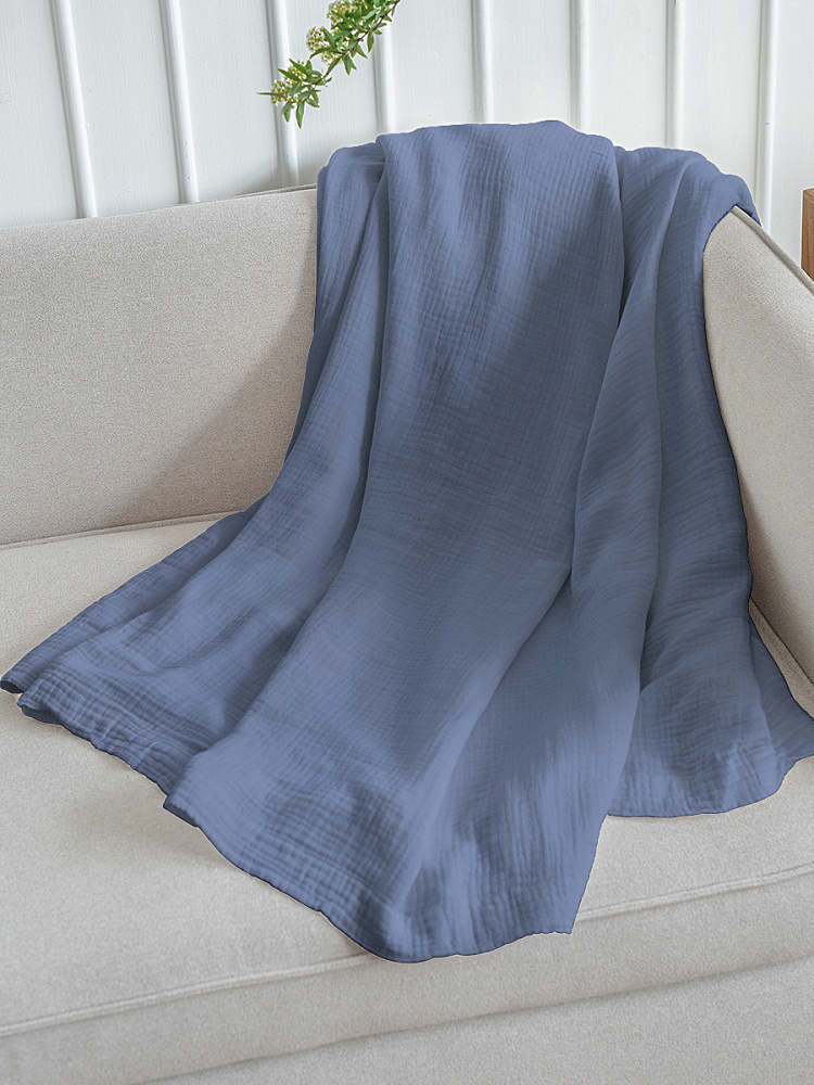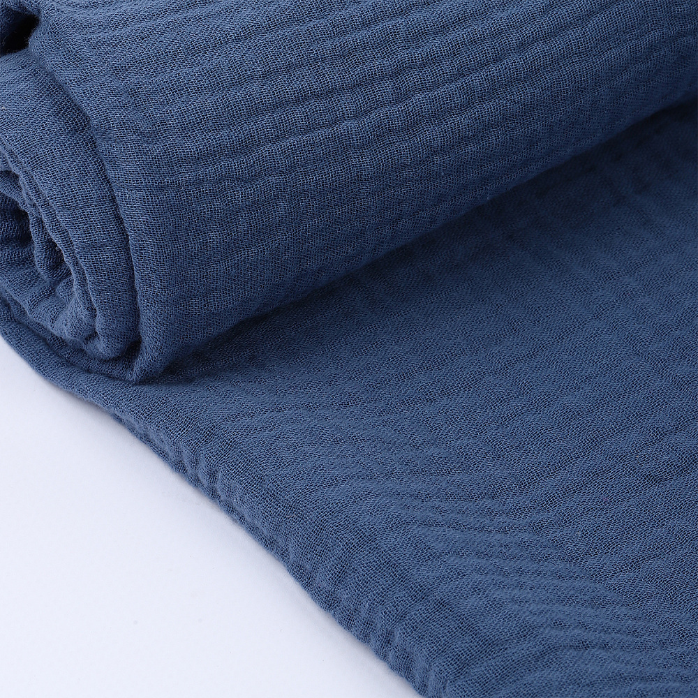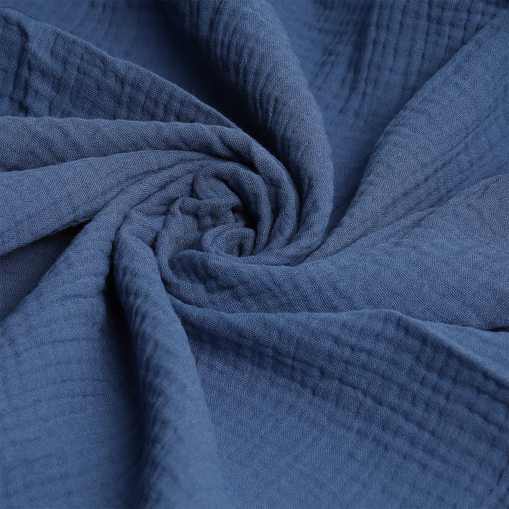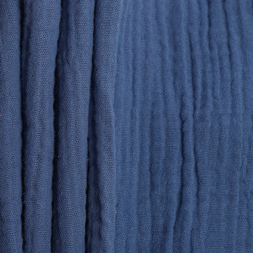 Двухслойная ткань Муслин с эффектом крэш — это натуральное волокно особого плетения хлопковых нитей. Муслин имеет легкую текстуру, нежную поверхность, а ввиду жатого эффекта создается впечатление воздушности ткани. Несмотря на внешнюю рыхлость, нити Муслина туго скучены, что придаёт изделию прочность. Также ткань обладает всеми положительными свойствами хлопковых полотен: воздухопроницаемостью и гипоаллергенностью, износостойкостью и гигроскопичностью, не подвержен появлению катышков и удобен в носке. Муслиновые изделия смотрятся интересно, стильно и необычно: трендовые летние костюмы, топы, легкие платья и рубашки, детская одежда и нежные домашние пижамы свободного кроя. Благодаря многослойности муслин не просвечивает, так что все изделия можно шить без подклада. Муслин требует грамотного ухода: допускается машинная стирка в деликатном режиме на низких оборотах при температуре не выше 40 градусов. Средства для стирки должны быть мягкими, без хлора.