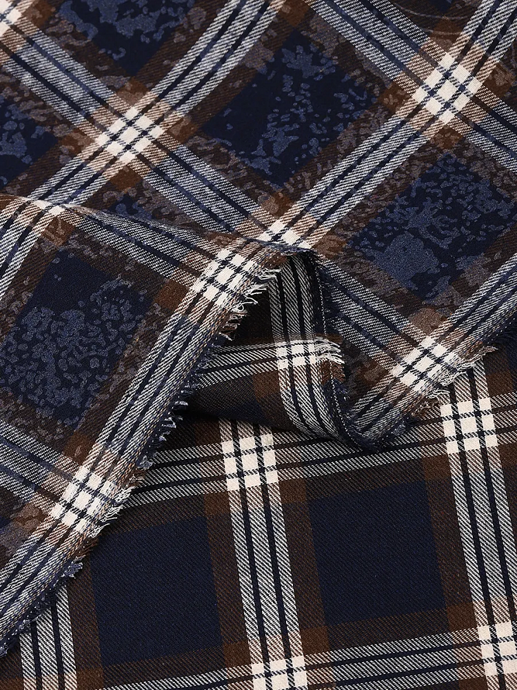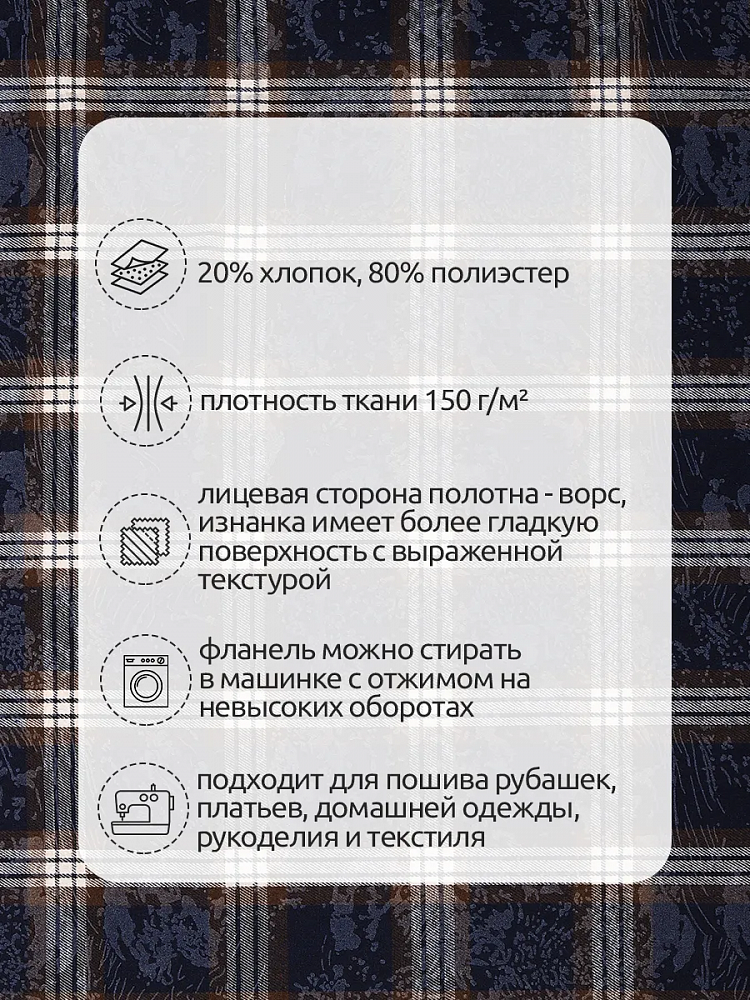 Ткань рубашечная Фланель - смесовый материал, отличающийся своей универсальностью. На лицевой стороне полотна ворс, изнанка имеет более гладкую поверхность с выраженной текстурой. Фланель обладает высокими износостойкими характеристиками, не тянется и не скатывается, при этом ткань мягкая и хорошо удерживает тепло. Актуальный принт в клетку популярен при пошиве таких изделий, как рубашки, платья, а также домашней одежды, рукоделия и текстиля. Фланель можно стирать в машинке с отжимом на невысоких оборотах