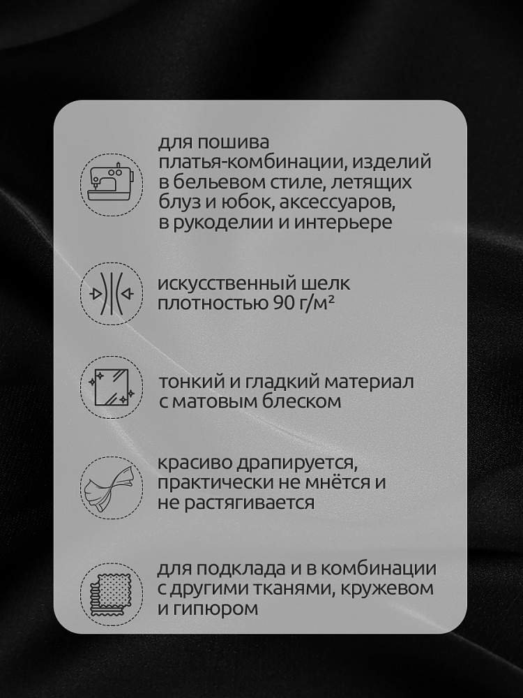 Армани шелк (искусственный шелк) - это синтетическая плательно-блузочная ткань, тонкая и нежная. Имеет приятную гладкую поверхность с матовым блеском, немного тянется в ширину полотна. Ткань красиво и легко драпируется, способна образовывать даже очень мелкие складки. Особенностью ткани является её близкое сходство по внешнему виду с натуральным шёлком. Идеален для пошива изделий в бельевом стиле и вечерних платьев, блузок, юбок, костюмов. Кроме того, это хороший вариант подклада под шифон, кружево или гипюр, используется для изготовления палантинов, платков и шарфиков. Светлые оттенки немного просвечивают.