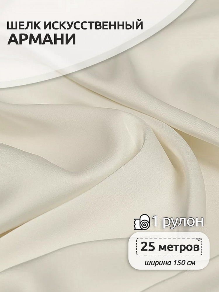 Армани шелк (искусственный шелк) - это синтетическая плательно-блузочная ткань, тонкая и нежная. Имеет приятную гладкую поверхность с матовым блеском, немного тянется в ширину полотна. Ткань красиво и легко драпируется, способна образовывать даже очень мелкие складки. Особенностью ткани является её близкое сходство по внешнему виду с натуральным шёлком. Идеален для пошива изделий в бельевом стиле и вечерних платьев, блузок, юбок, костюмов. Кроме того, это хороший вариант подклада под шифон, кружево или гипюр, используется для изготовления палантинов, платков и шарфиков. Светлые оттенки немного просвечивают.