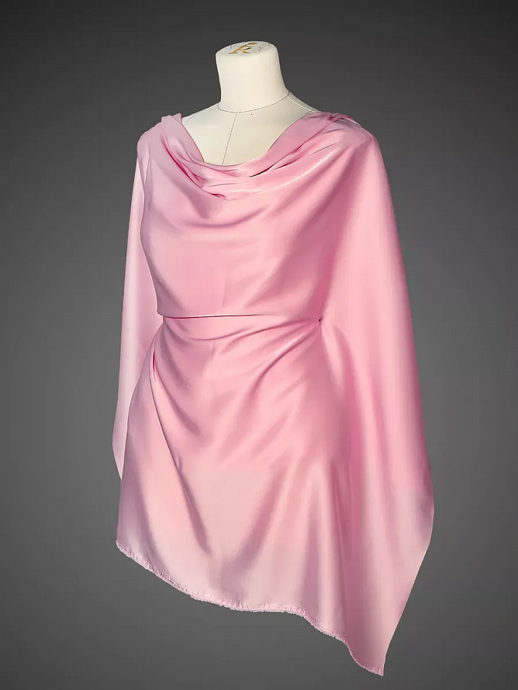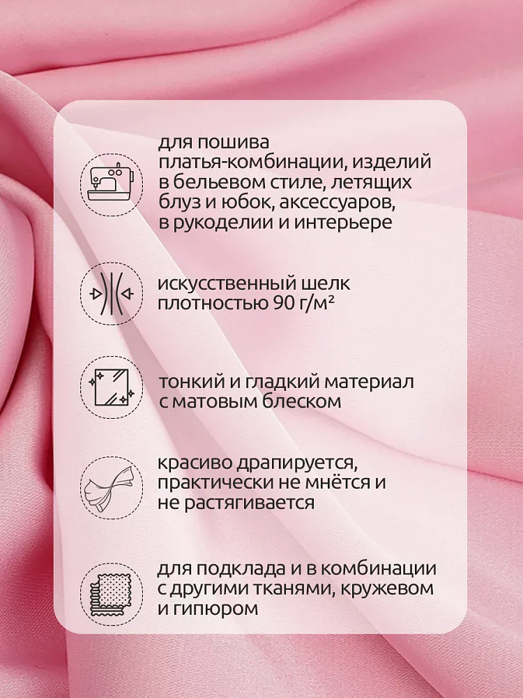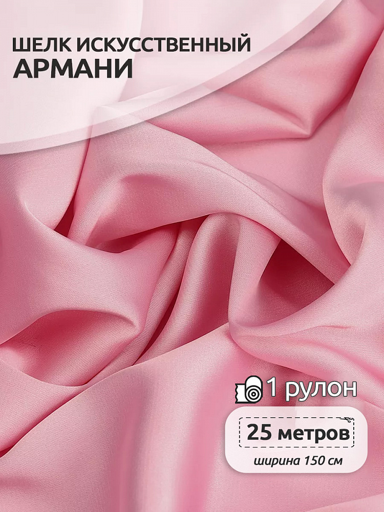 Армани шелк (искусственный шелк) - это синтетическая плательно-блузочная ткань, тонкая и нежная. Имеет приятную гладкую поверхность с матовым блеском, немного тянется в ширину полотна. Ткань красиво и легко драпируется, способна образовывать даже очень мелкие складки. Особенностью ткани является её близкое сходство по внешнему виду с натуральным шёлком. Идеален для пошива изделий в бельевом стиле и вечерних платьев, блузок, юбок, костюмов. Кроме того, это хороший вариант подклада под шифон, кружево или гипюр, используется для изготовления палантинов, платков и шарфиков. Светлые оттенки немного просвечивают.
