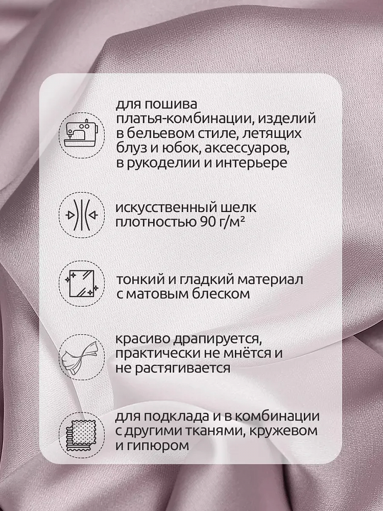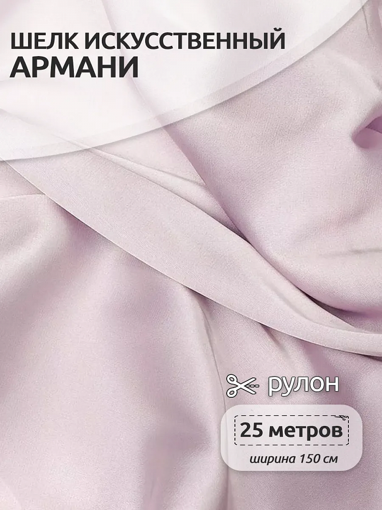 Армани шелк (искусственный шелк) - это синтетическая плательно-блузочная ткань, тонкая и нежная. Имеет приятную гладкую поверхность с матовым блеском, немного тянется в ширину полотна. Ткань красиво и легко драпируется, способна образовывать даже очень мелкие складки. Особенностью ткани является ее близкое сходство по внешнему виду с натуральным шелком. Идеален для пошива изделий в бельевом стиле и вечерних платьев, блузок, юбок, костюмов. Кроме того, это хороший вариант подклада под шифон, кружево или гипюр, используется для изготовления палантинов, платков и шарфиков. Светлые оттенки немного просвечивают.