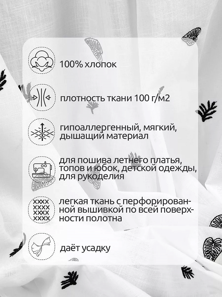 Ткань Шитье, изготовленная из натурального хлопка, подходит для пошива лёгких блуз, летних платьев и сарафанов, а также элементов домашнего декора. Благодаря вышивке-перфорации по всему полотну прошва отличается фактурностью, гипоаллергенна, гигроскопична и обладает высокими показателями воздухообмена. Уход за тканью подразумевает отказ от замачивания и бережную стирку. Лучше всего отдать предпочтение ручной стирке при температуре не выше 40 градусов и в качестве чистящего средства использовать порошок для деликатных тканей или жидкое мыло. Перед раскроем рекомендуется пропарить утюгом, чтобы ткань дала возможную усадку.