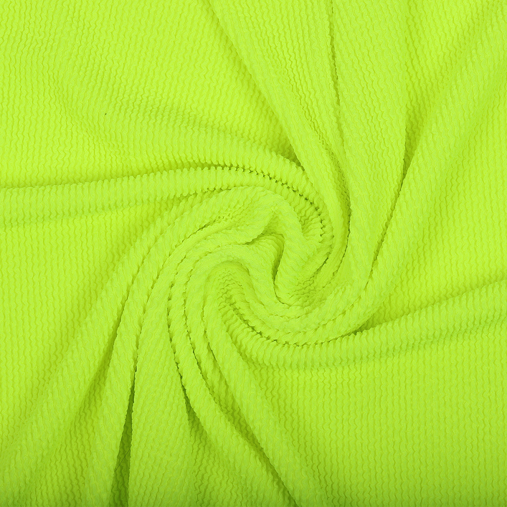 Ткань Бифлекс жатка – синтетический эластичный трикотаж, имеющий текстурированную поверхность. Лицевая сторона имеет гофрированную фактуру, а изнанка имеет однородную ребристую поверхность. Благодаря составу бифлекс тянется, увеличивая площадь полотна в несколько раз, при этом не рвётся, не мнется, гипоаллергенен и хорошо отводит влагу. Материал отлично подходит для пошива спортивных и танцевальных костюмов и купальников, так как облегает тело, но не натирает. При стирке рекомендуется применять жидкие моющие средства, температура воды не должна превышать 30–40°С. При соблюдении условий ухода, жатый эффект не исчезает при намокании и после стирок. Данный артикул обладает высоким коэффициентом сжатия, что обеспечивает более высокую плотность, чем у аналогов.