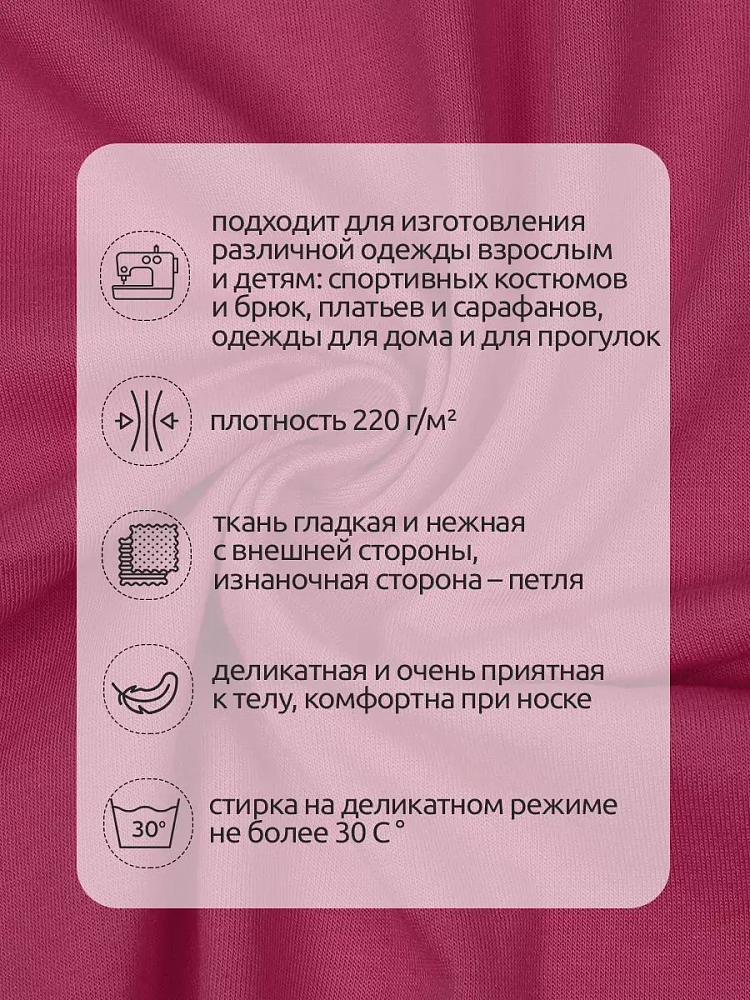 Футер с хлопком 2х нитка петля – деликатная и приятная для тела ткань. Она гладкая с внешней стороны, мягкая и нежная – с внутренней, благодаря этому удивительно комфортна при носке. Изнаночная сторона – петля. Футер ткань для шитья состоит из 70% хлопка 25% полиэстера и 5% лайкры. Добавленный в состав эластан делают ткань износоустойчивой, менее сминаемой и хорошо сохраняющей форму. Из футера создают одежду для детей, легкую одежду для повседневной жизни, постельное белье, одежду для дома, спортивные костюмы, платья, шорты, футболки. 1кг, 2,4м