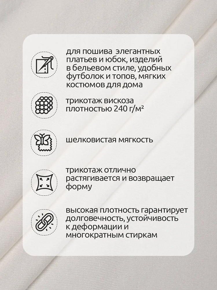 Трикотаж вискоза плотностью 240 г/м² — это идеальный выбор для создания одежды, которая сочетает комфорт и элегантность. Материал обладает мягкой, приятной на ощупь текстурой и хорошей эластичностью, что делает его универсальным для пошива платьев, футболок, юбок, домашней одежды и других изделий. Особенности и преимущества: Шелковистая мягкость. Вискоза дарит ткани нежный блеск и гладкость, делая вещи невероятно приятными к телу. Эластичность. Трикотаж отлично растягивается и возвращает форму, обеспечивая удобство при носке. Прочность. Высокая плотность гарантирует долговечность, устойчивость к деформации и многократным стиркам. Дышащие свойства. Ткань пропускает воздух, создавая комфортный микроклимат, что особенно важно в жаркую погоду. Легкость в уходе. Материал не требует сложных процедур стирки и глажки. Трикотаж вискоза идеально подходит для пошива: элегантных платьев и юбок нижнего белья удобных футболок и топов мягких костюмов для дома спорти