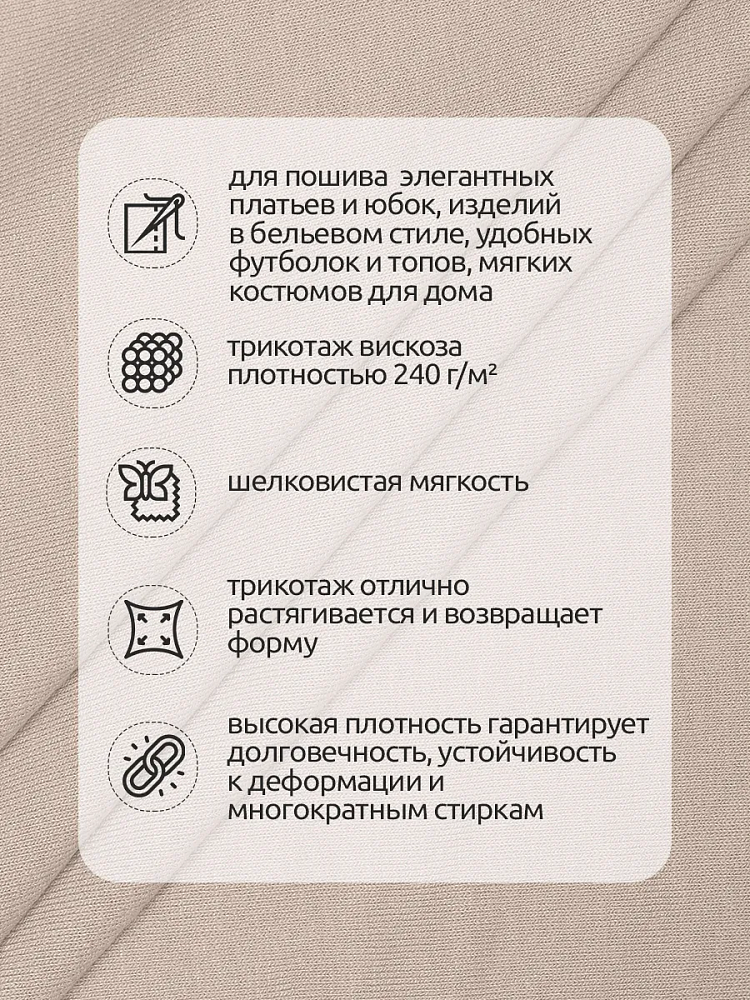 Трикотаж вискоза плотностью 240 г/м² — это идеальный выбор для создания одежды, которая сочетает комфорт и элегантность. Материал обладает мягкой, приятной на ощупь текстурой и хорошей эластичностью, что делает его универсальным для пошива платьев, футболок, юбок, домашней одежды и других изделий. Особенности и преимущества: Шелковистая мягкость. Вискоза дарит ткани нежный блеск и гладкость, делая вещи невероятно приятными к телу. Эластичность. Трикотаж отлично растягивается и возвращает форму, обеспечивая удобство при носке. Прочность. Высокая плотность гарантирует долговечность, устойчивость к деформации и многократным стиркам. Дышащие свойства. Ткань пропускает воздух, создавая комфортный микроклимат, что особенно важно в жаркую погоду. Легкость в уходе. Материал не требует сложных процедур стирки и глажки. Трикотаж вискоза идеально подходит для пошива: элегантных платьев и юбок нижнего белья удобных футболок и топов мягких костюмов для дома спорти