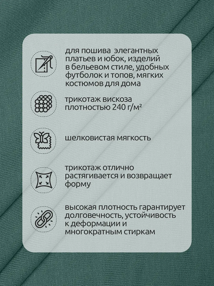 Трикотаж вискоза плотностью 240 г/м² — это идеальный выбор для создания одежды, которая сочетает комфорт и элегантность. Материал обладает мягкой, приятной на ощупь текстурой и хорошей эластичностью, что делает его универсальным для пошива платьев, футболок, юбок, домашней одежды и других изделий. Особенности и преимущества: Шелковистая мягкость. Вискоза дарит ткани нежный блеск и гладкость, делая вещи невероятно приятными к телу. Эластичность. Трикотаж отлично растягивается и возвращает форму, обеспечивая удобство при носке. Прочность. Высокая плотность гарантирует долговечность, устойчивость к деформации и многократным стиркам. Дышащие свойства. Ткань пропускает воздух, создавая комфортный микроклимат, что особенно важно в жаркую погоду. Легкость в уходе. Материал не требует сложных процедур стирки и глажки. Трикотаж вискоза идеально подходит для пошива: элегантных платьев и юбок нижнего белья удобных футболок и топов мягких костюмов для дома спорти