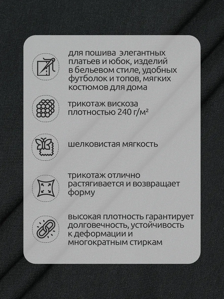 Трикотаж вискоза плотностью 240 г/м² — это идеальный выбор для создания одежды, которая сочетает комфорт и элегантность. Материал обладает мягкой, приятной на ощупь текстурой и хорошей эластичностью, что делает его универсальным для пошива платьев, футболок, юбок, домашней одежды и других изделий. Особенности и преимущества: Шелковистая мягкость. Вискоза дарит ткани нежный блеск и гладкость, делая вещи невероятно приятными к телу. Эластичность. Трикотаж отлично растягивается и возвращает форму, обеспечивая удобство при носке. Прочность. Высокая плотность гарантирует долговечность, устойчивость к деформации и многократным стиркам. Дышащие свойства. Ткань пропускает воздух, создавая комфортный микроклимат, что особенно важно в жаркую погоду. Легкость в уходе. Материал не требует сложных процедур стирки и глажки. Трикотаж вискоза идеально подходит для пошива: элегантных платьев и юбок нижнего белья удобных футболок и топов мягких костюмов для дома спорти