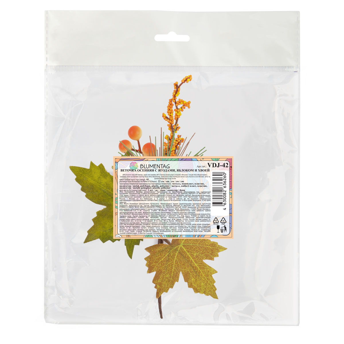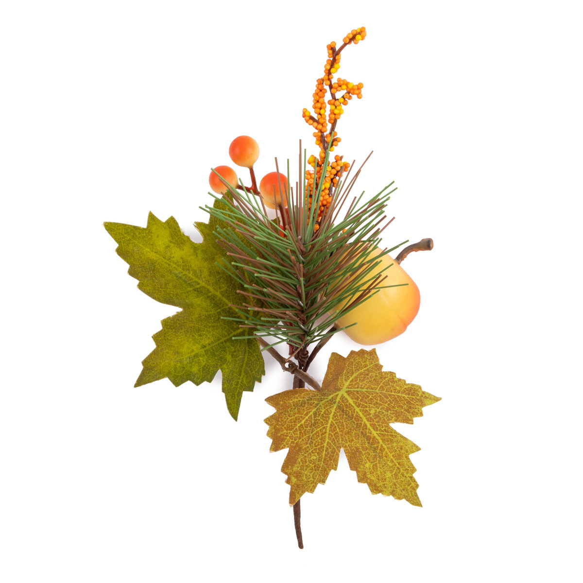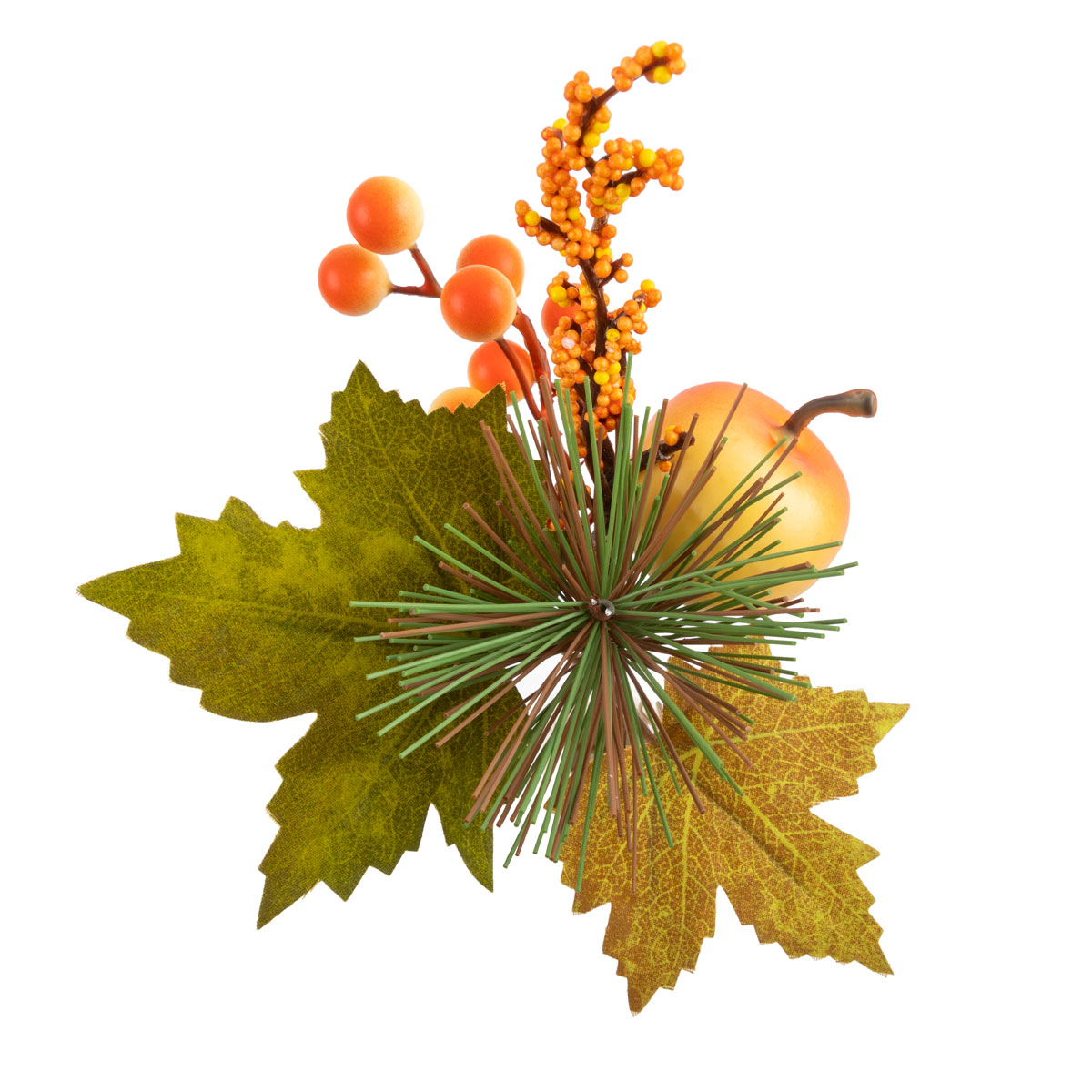 На веточке расположено декоративно декоративное яблоко, искусственные ягоды, хвоя и листья.