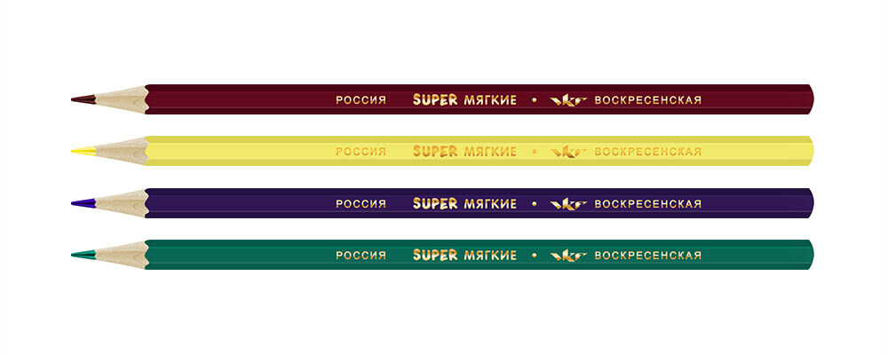 Проклейка стержня осуществлена по специальной технологии. Состав набора - цвета карандашей: красно-коричневый, лимонный, фиолетовый. травяная зелень.