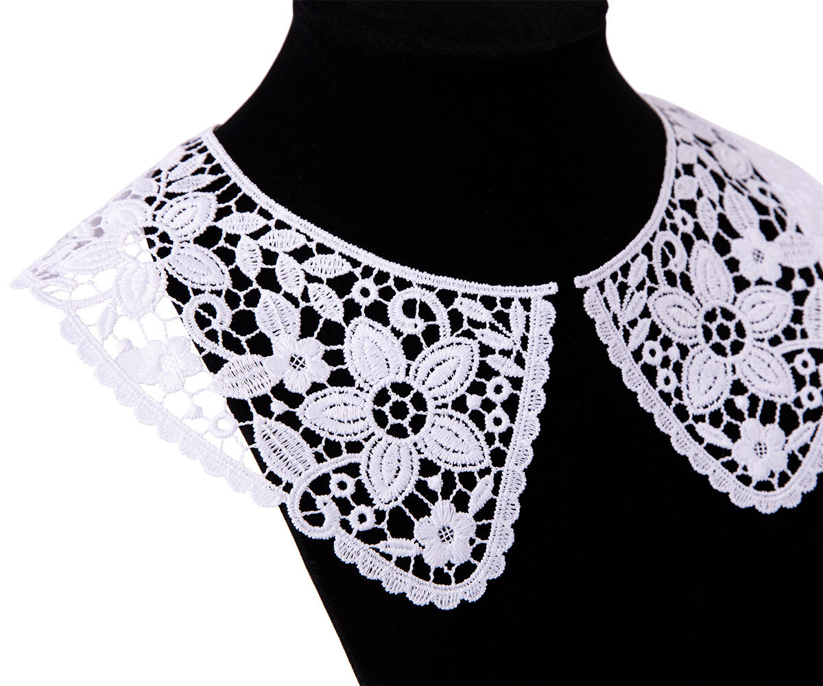 Воротник из гипюра состоит из выпуклых кружевных элементов, соединенных сетчатыми "связками". Воротник имеет ажурное плетение, что придает ему особый изыск. применяется для отделки школьной формы, женских платьев, а также можно использовать в виде декоративных вставок: в одежде, текстильных изделий и т.д.