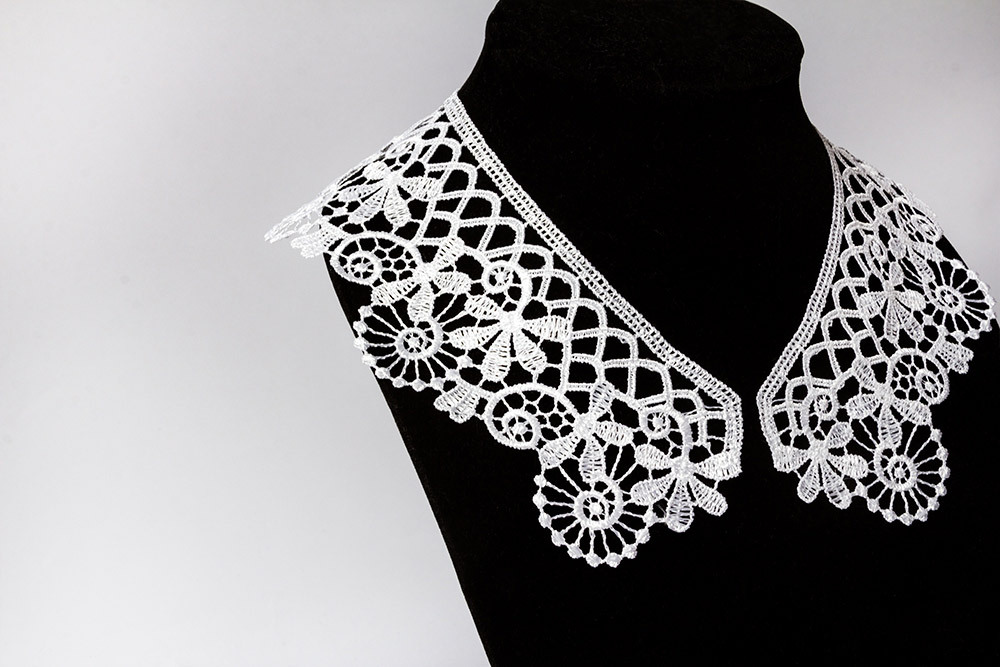 Воротник из гипюра состоит из выпуклых кружевных элементов, соединенных сетчатыми "связками". Воротник имеет ажурное плетение, что придает ему особый изыск. применяется для отделки школьной формы, женских платьев, а также можно использовать в виде декоративных вставок: в одежде, текстильных изделий и т.д.