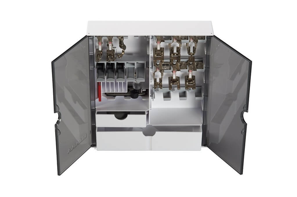 В таком ящике можно с лёгкостью хранить лапки, шпульки, иглы и другие аксессуары. Так они всегда на виду и находятся под рукой. Коробка ставится либо на рабочий стол, либо закрепляется на задней панели машинки. Подходит для следующих моделей: BERNINA 700, BERNINA 710, BERNINA 720, BERNINA 735, BERNINA 740, BERNINA 750 QE, BERNINA 765, BERNINA 770 QE, BERNINA 770 QE PLUS, BERNINA 780, BERNINA 790, BERNINA 790 PLUS
