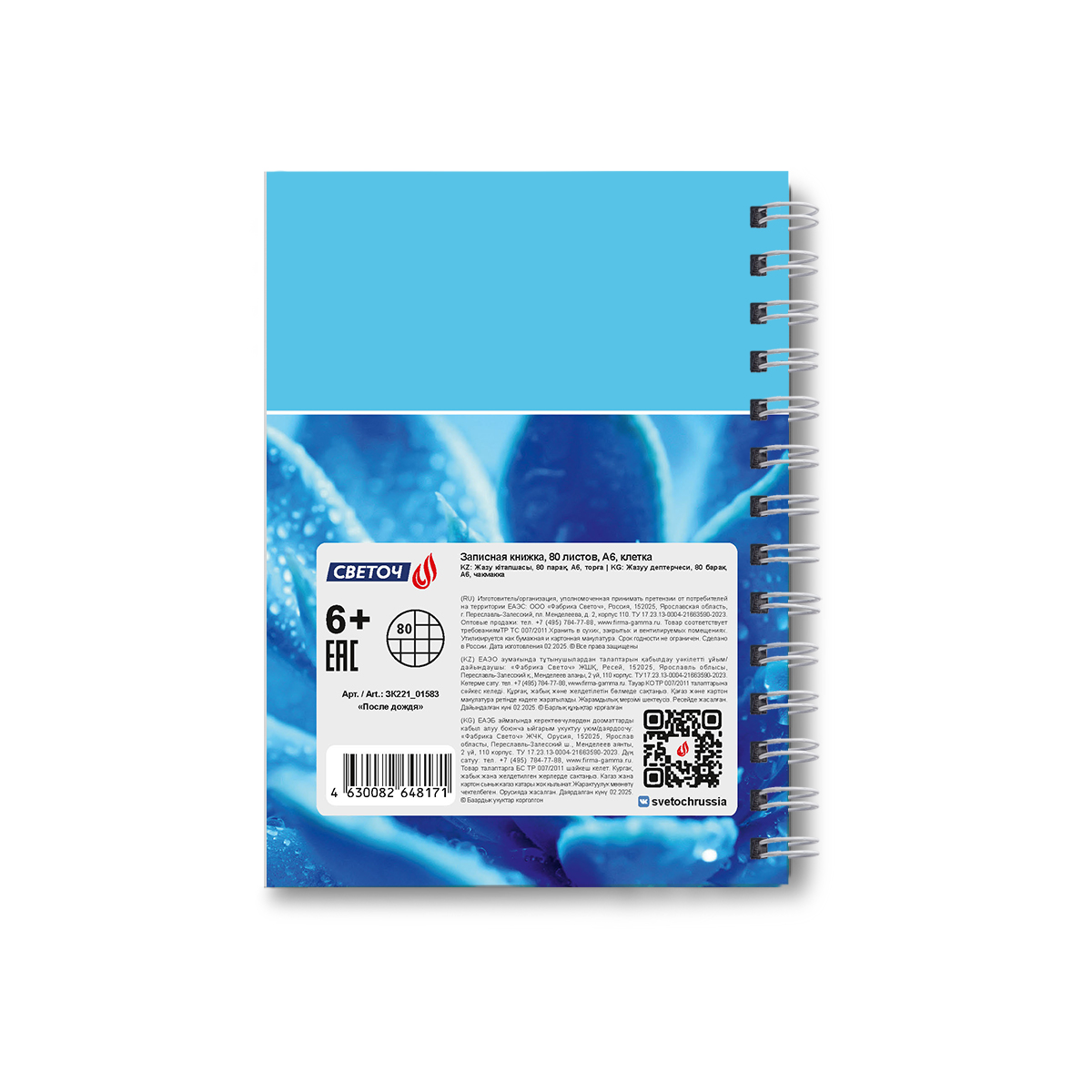 Записная книжка с твердым переплетом, глянцевая ламинация, на гребне A6 80 л. 4 шт клетка, После дождя 01583, ЗК221 Светоч
